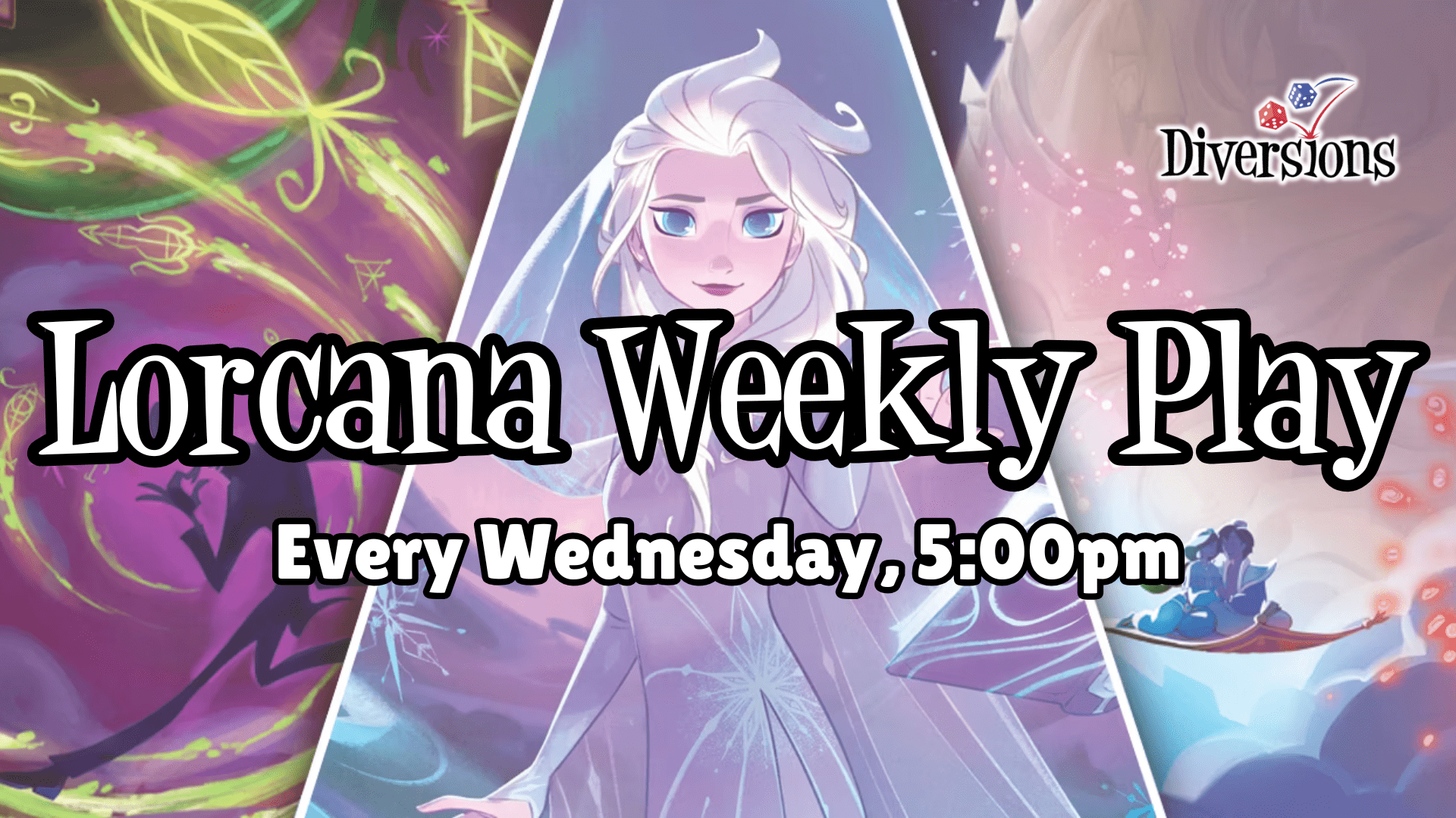 Join us every Wednesday for Weekly Open Play for Disney: Lorcana! Bring your decks from home to play against others in this open format. Promos from the current OP set will be distributed to players during the event.