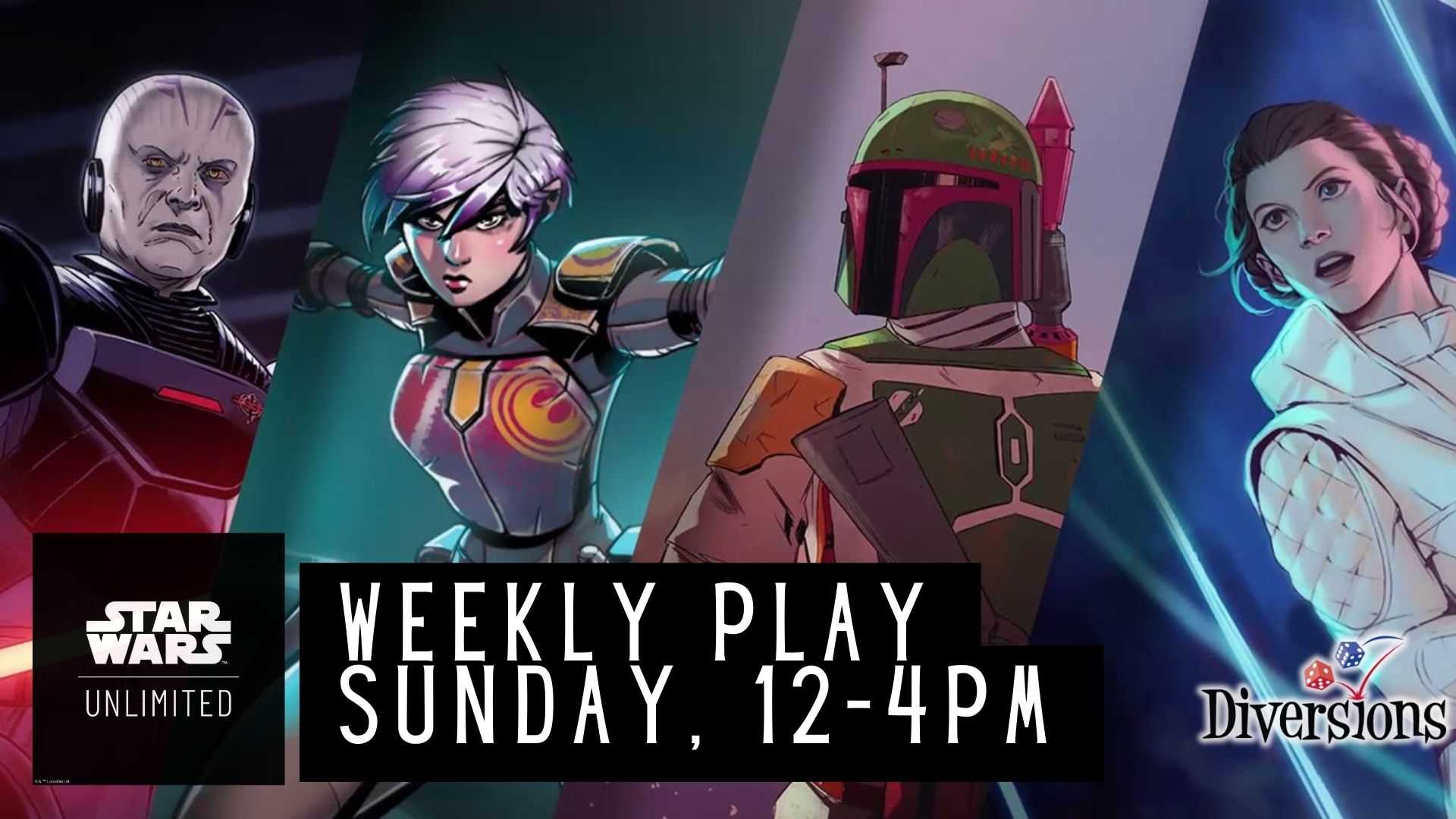 Join us for Star Wars Unlimited Weekly Play – a casual event to learn, play, and trade this new and growing TCG. Every Sunday from 12-4pm! Promos and prizes will be given out to attendees from the official Organized Play Weekly Kits.