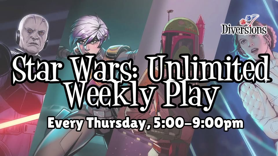 Weekly Play at Diversions Puzzles & Games allows players to choose how they want to play Star Wars: Unlimited during the evening – casual constructed 1v1s, Twin Suns, or draft are all available for the store to run, with player consensus!