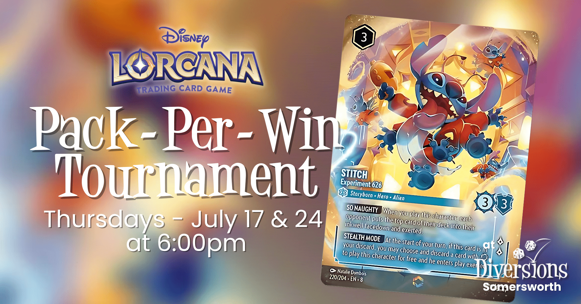 Pack per win tournament. 3 rounds Bo3 starting at 6:00pm Cost: $11.98 July 17 https://tcg.ravensburgerplay.com/events/160179July 24 https://tcg.ravensburgerplay.com/events/160182
