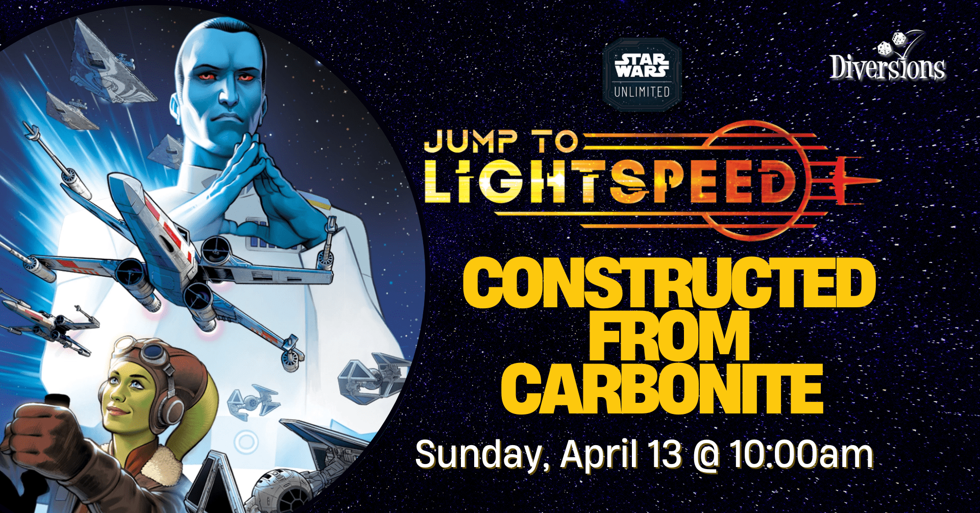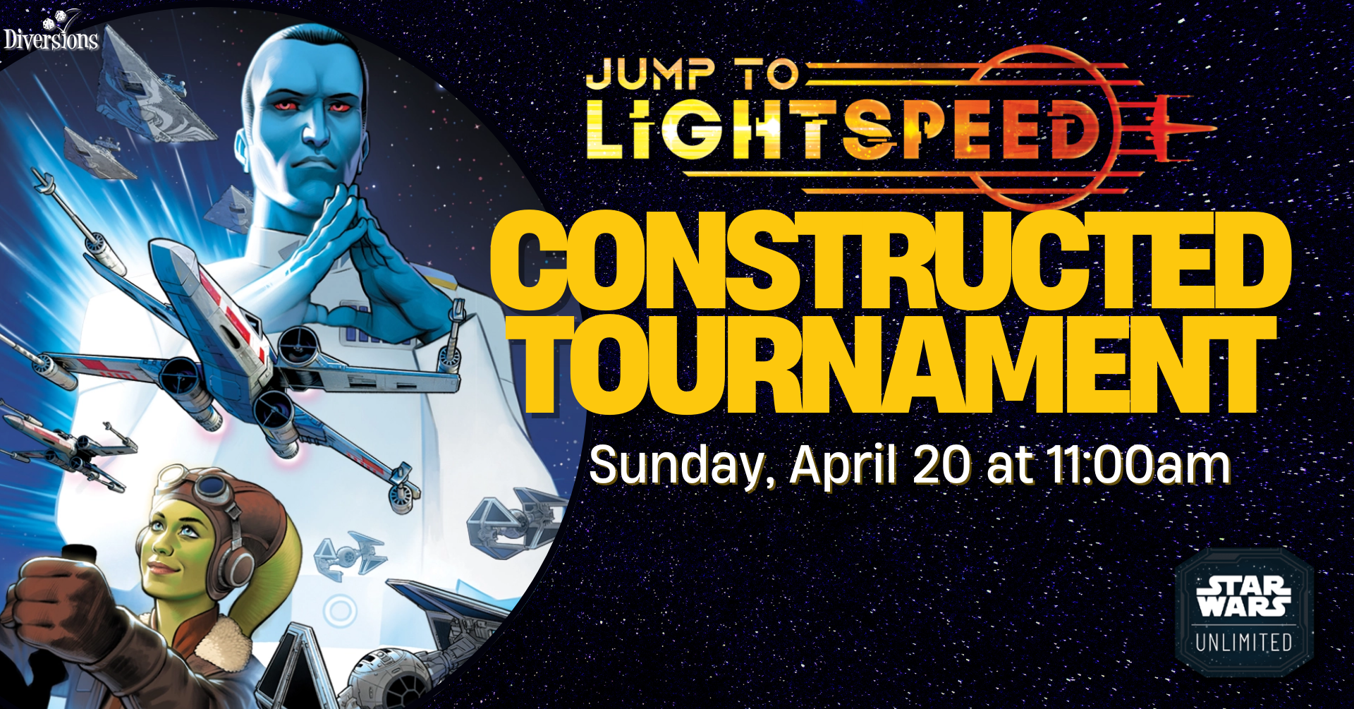 Join us on Sunday, April 13 for a Star Wars: Unlimited Constructed tournament! This tournament starts at 10:00am. Registration & Rounds: Entry for this event is $25.00 (plus fees).… |